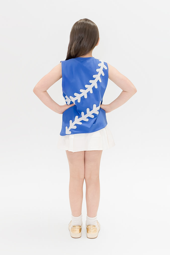 Let your little slugger shine on game day in this vibrant royal blue tank! Featuring eye-catching sequins that catch the light with every swing and cheer, it's the perfect blend of sporty style and sparkle. Lightweight and comfortable for all-day wear, whether they're in the stands or stealing bases. A fun way to show team spirit with personality!