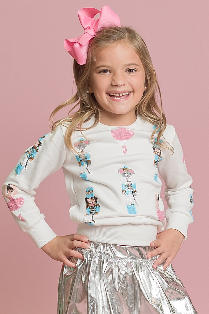Step into the holiday magic with this enchanting Nutcracker White Sweatshirt, designed to make your little one feel like a prima ballerina! Featuring whimsical sequin details and nutcracker-inspired imagery, this cozy pullover brings festive charm to every twirl and dance move. Perfect for holiday celebrations, winter playdates, or snuggling by the Christmas tree, it combines comfort with that special seasonal sparkle your child will adore.