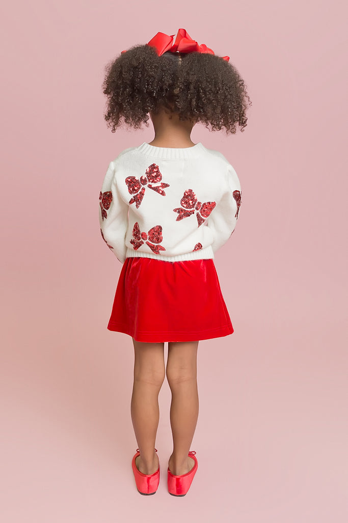 Wrap your little one in cozy charm with the Red Bows Cream Sweater. This soft cream knit is playfully adorned with vibrant red sequin bows, adding a touch of whimsy to her look. Perfect for brightening chilly days or making a festive statement, it pairs easily with jeans or skirts for a fun, stylish vibe.