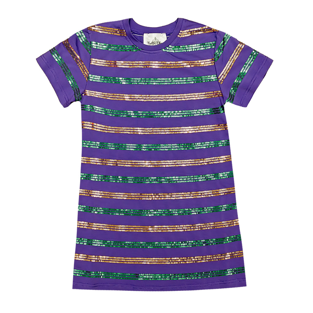 Shimmer and shine in this show-stopping dress that blends bold color blocking with eye-catching sequin stripes. The rich purple base provides a sophisticated canvas for vibrant green and gold accents that catch the light with every move. Perfect for parties, celebrations, or whenever you want to turn heads, this playful piece transforms any occasion into a glamorous moment. The sequin detailing adds texture and dimension while the striped pattern keeps things fun and modern. Dress it up with heels and statement jewelry for maximum impact.