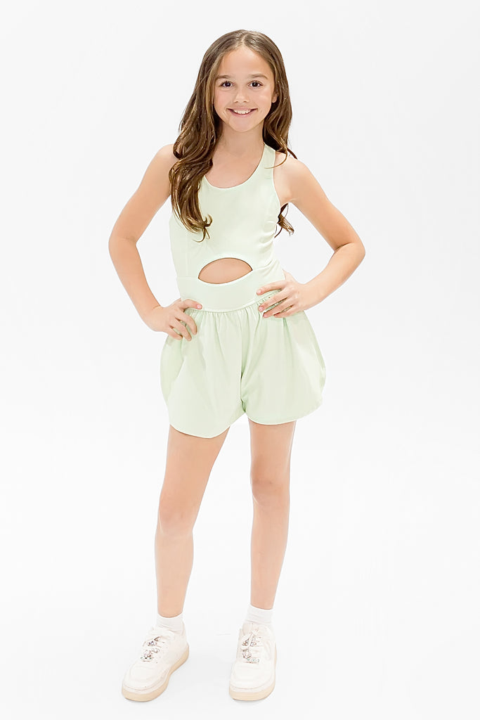 Let your little adventurer move freely in the Haddie Romper, a playful mint green one-piece designed for active kids who love to explore. Featuring charming criss-cross straps that add a touch of style, this romper keeps up with every jump, climb, and dash. The soft, beautiful mint hue is perfect for playdates, outdoor adventures, or everyday wear. Comfortable, cute, and ready for anything your busy tot throws at it!