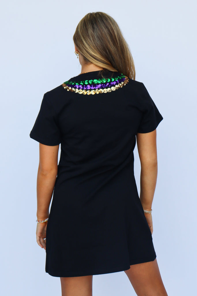 Slip into the spirit of celebration with this fun and fabulous black dress adorned with a sequin bead design. Whether you're dancing through the streets at Mardi Gras or turning heads at a party, this dress delivers both style and ease in one dazzling package.