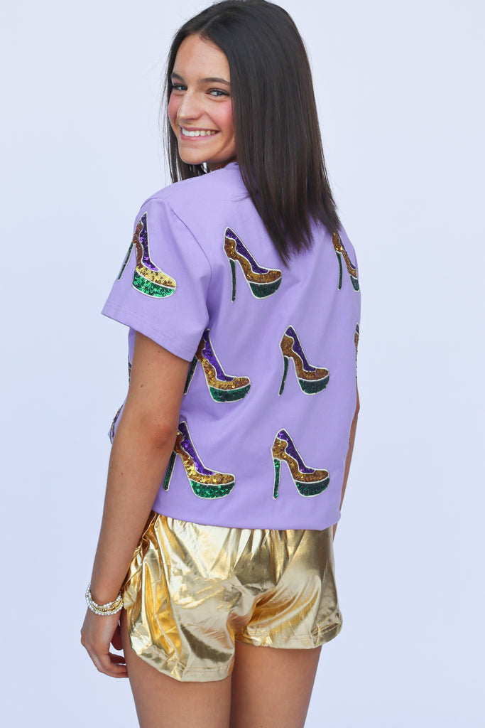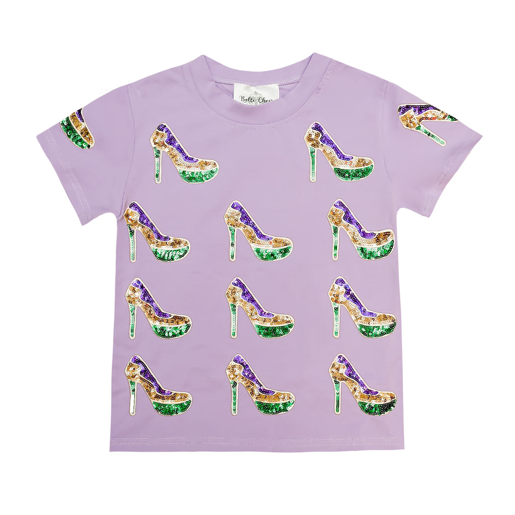 Step into the spirit of celebration with this playful short sleeve top featuring shimmering sequin high heel icons. Perfect for Mardi Gras festivities, parade season, or whenever you want to add a dash of glittery glamour to your everyday look. The soft, comfortable fabric keeps you feeling great all day long, while the eye-catching heel designs spark conversation and joy. Whether you're dancing down the street or cheering from the sidelines, this fun tee brings festive energy and fabulous style to any occasion.