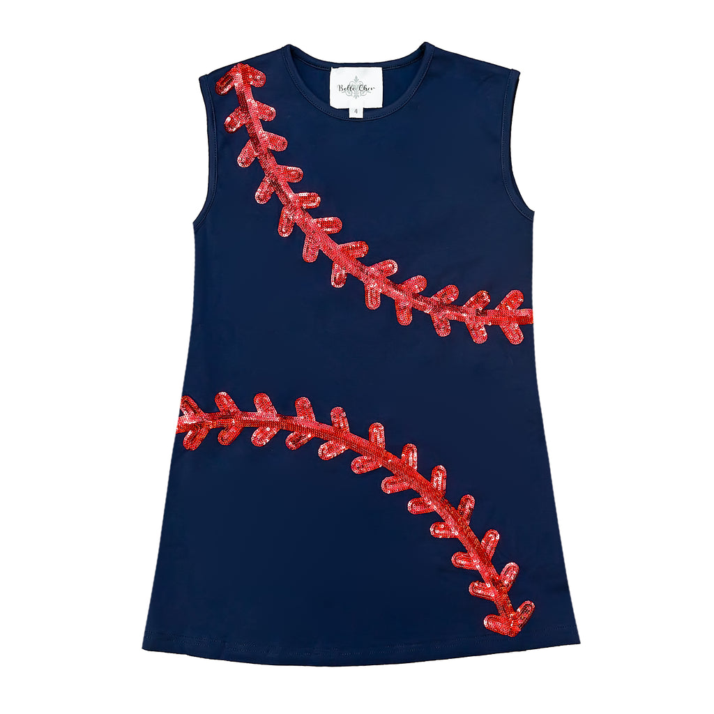 Strike out in style with this Baseball Navy and Red Dress! Featuring eye-catching red sequins that shimmer with every move, this playful piece combines sporty vibes with glamorous flair. Perfect for game day celebrations, themed parties, or anyone who loves mixing athletic energy with sparkle. The classic navy base keeps things grounded while those dazzling sequins steal the show. Whether you're cheering from the stands or dancing the night away, this dress brings the fun and the glam!