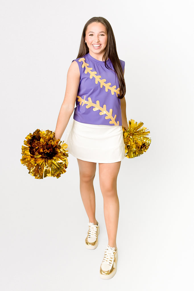 Shine bright on game day in this eye-catching purple tank! Covered in shimmering sequins that catch the light with every move, it's the perfect way to show your team spirit with serious sparkle. Whether you're cheering from the stands or celebrating a victory, this playful piece brings the glam and the game. Get ready to turn heads and steal the spotlight!